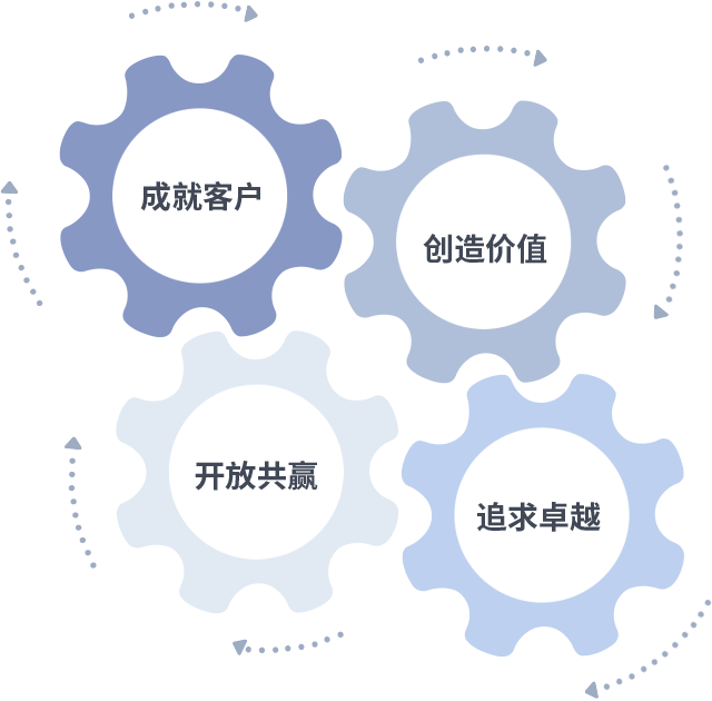 成就客户是一切决策的出发点,,,创造价值是衡量所有工作的标准,,,,追求卓越是我们做事做人的态度,,开放共赢是我们的格局也是最终的结果。。。价值观的齿轮环环相扣,,,推动着组织里的每个人不断向前。。。
